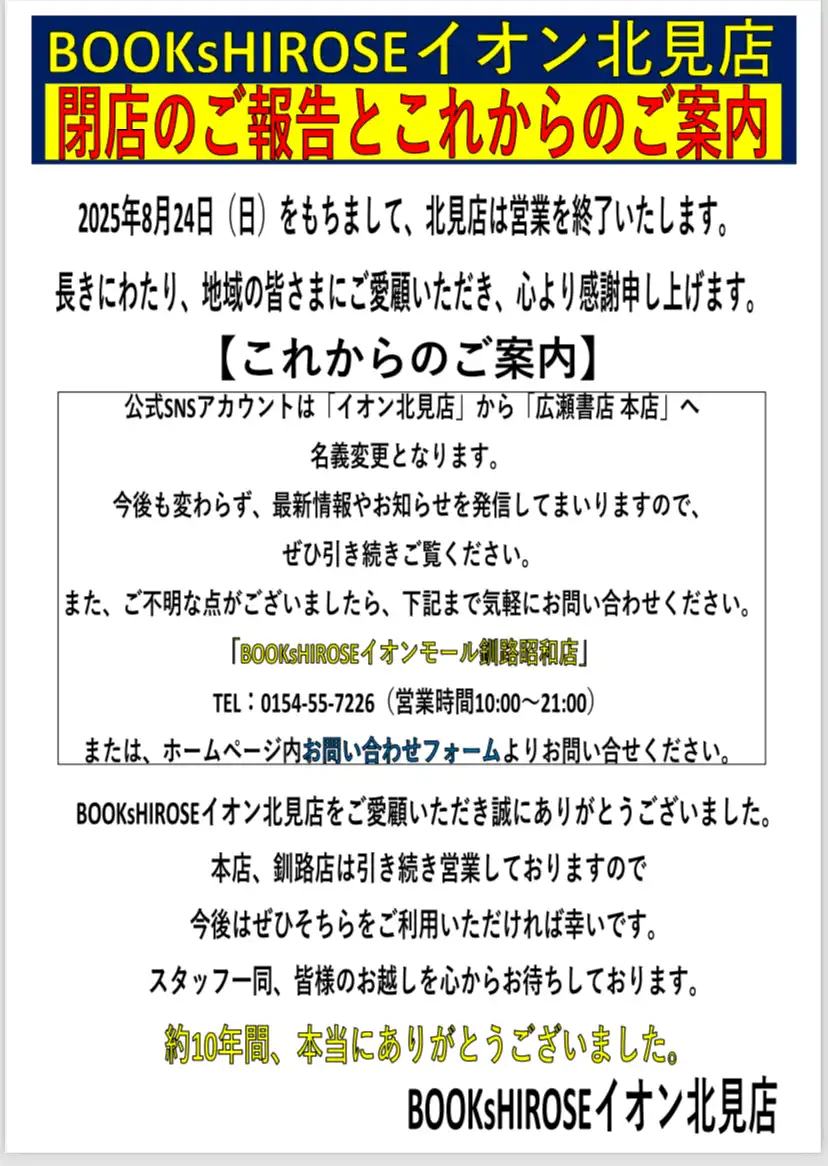 BOOKsHIROSEイオン北見店よりお客様へ